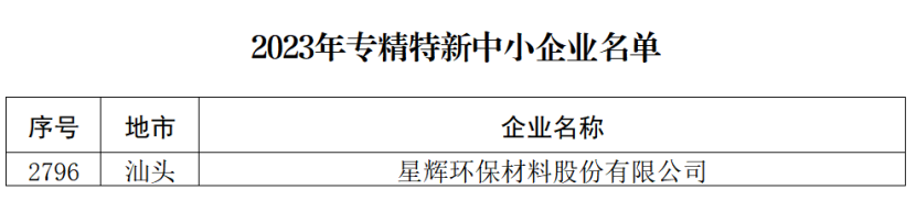 近日,廣東省工業(yè)和信息化廳公布了“2023年廣東省專精特新中小企業(yè)名單”(通告[2024]1號),星輝環(huán)材(以下簡稱“公司”)成功通過廣東省“專精特新”企業(yè)認定。